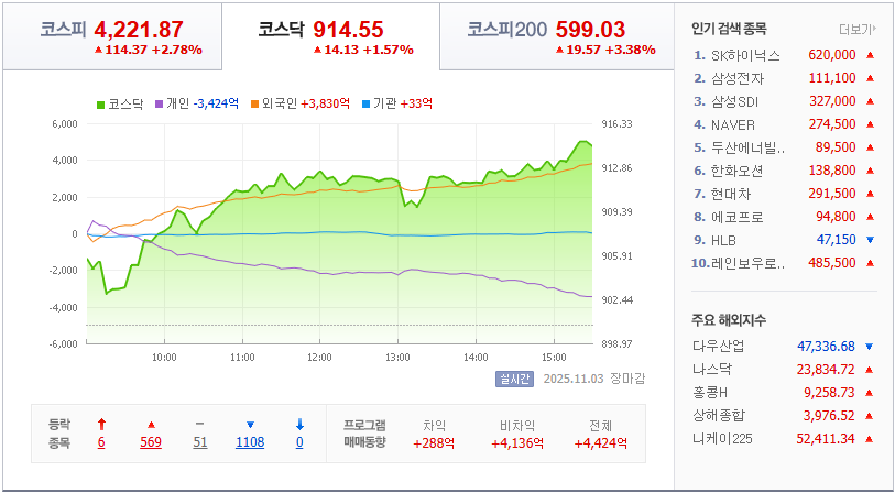 코스피는 4,221.87(+2.78%)로 사상최고가를 경신했고, 코스닥은 **914.55(+1.57%)**로 마감했습니다. 대형 반도체 강세가 지수 레벨을 끌어올렸고, ‘4,000→4,100→4,200’ 돌파가 연쇄적으로 진행됐습니다.