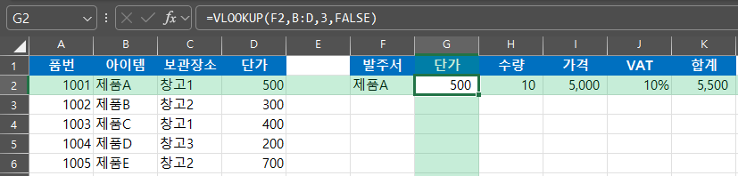 =VLOOKUP(찾을값, 범위, 열번호, 정확히찾기)
