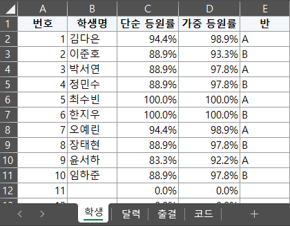 학생 시트: 등원률(단순/가중) 계산 수식