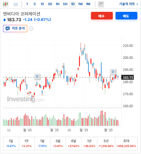 - NVDA는 이날 **약 -0.8% 하락(183달러대)**로 조정을 받았습니다.