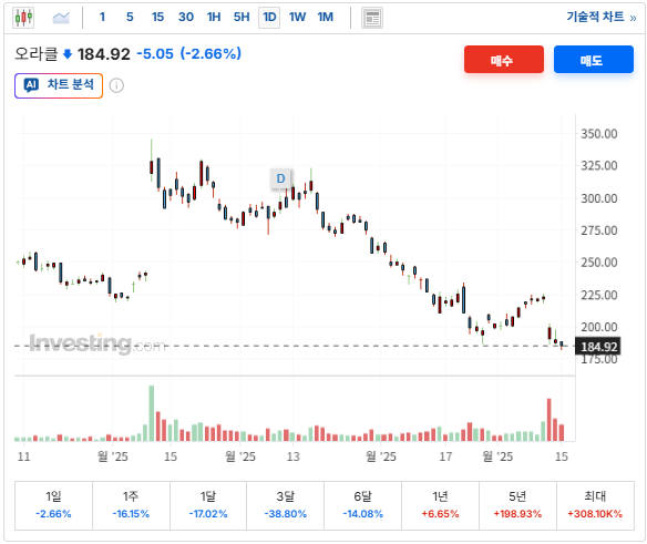 - **12월 15일 종가 기준 약 +0.36% 상승(184.23달러)**로, 다른 AI 인프라 대비 상대적으로 견조했습니다.