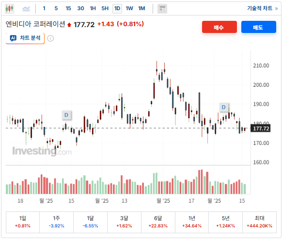 마켓 무버 집계 기준으로 엔비디아는 약 177~178달러, +0.8% 내외 상승으로 마감했습니다.