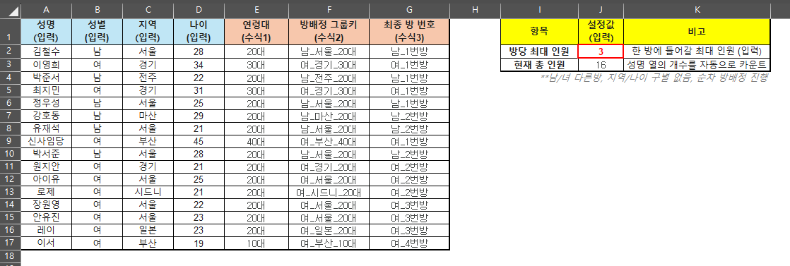 먼저 시트의 상단이나 우측(예: K2 셀)에 **[방당 최대 인원]**을 입력할 수 있는 칸을 만듭니다. 여기에 '3'을 입력하면 3인 1실, '4'를 입력하면 4인 1실 기준으로 배정됩니다.