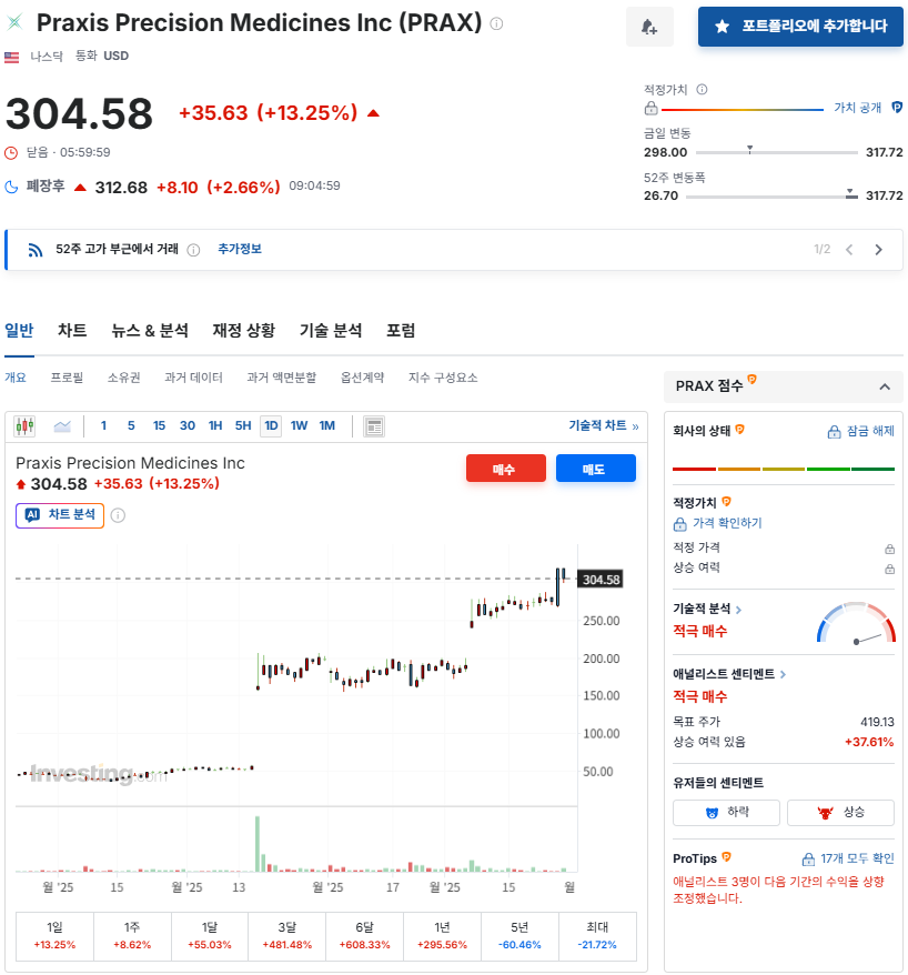 - PRAX, SLS처럼 FDA·학회 뉴스로 이틀 만에 +10~20% 이상 움직이는 종목이 있는 반면,