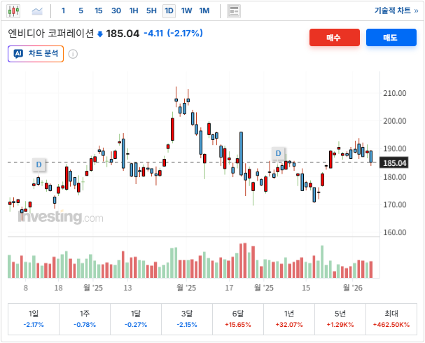 - 1/8 종가 184.51달러, 전일(189.11달러) 대비 약 -2.4% 조정.