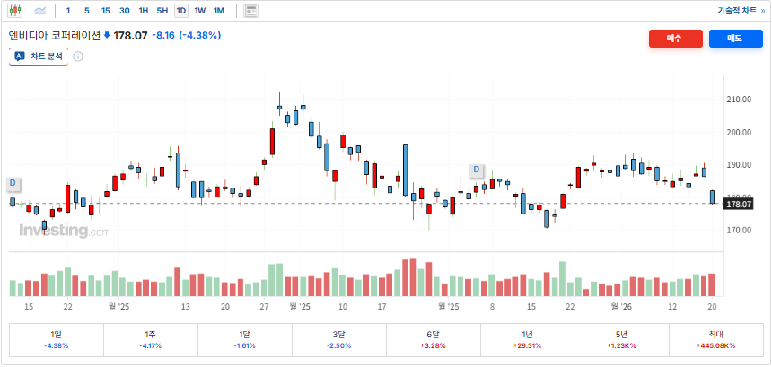- 주가: 178달러대, 하루 -4% 안팎 하락
