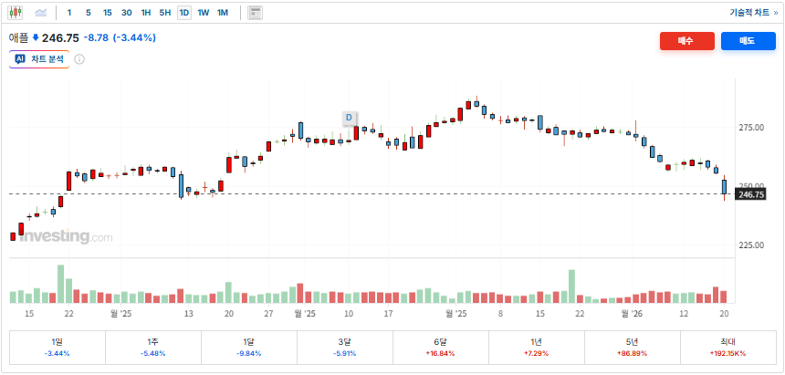 2) 애플(AAPL) – AI 파트너십은 호재, 오늘은 “그냥 같이 얻어맞은 날”