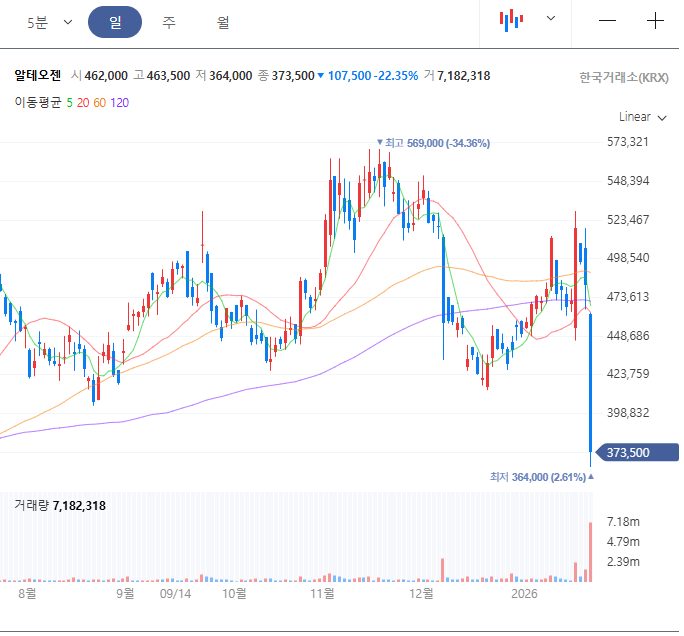 2026년 1월 21일 알테오젠은 ✅ MSD ‘키트루다 SC’ 로열티 2% 확인과 ✅ GSK와의 기술이전(4,200억) 규모 실망이 겹치며 장중 -22%까지 급락했고, 기관·외국인 대량 매도 vs 개인 폭탄 매수(약 6,400억 규모)가 맞부딪힌 전형적인 ‘알테오젠 쇼크 + 패닉 바잉’ 구간이었습니다.