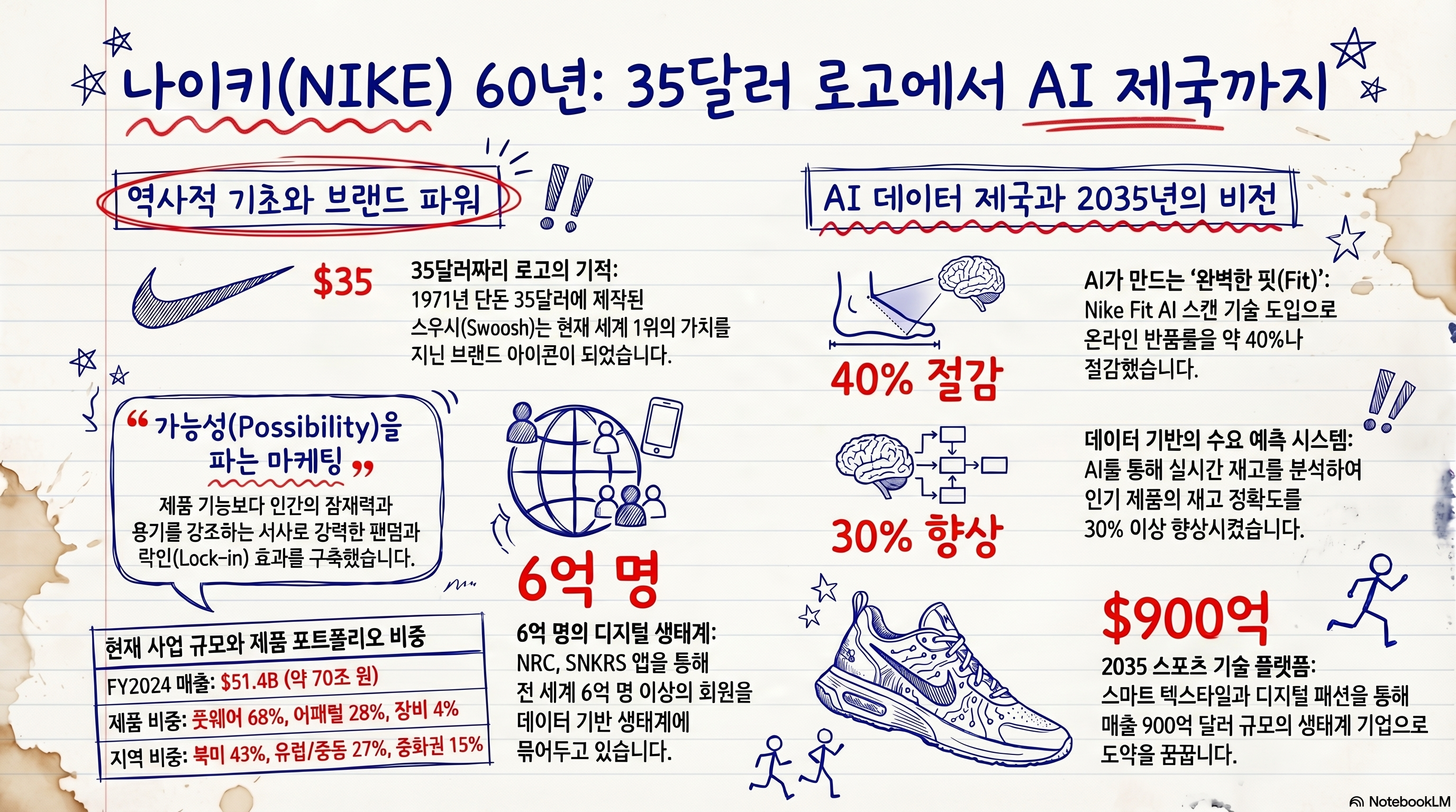 나이키는 35달러짜리 로고로 시작해 60년 만에 연 $51B 매출의 스포츠 문화 제국을 만들었습니다. 제품이 아닌 서사를, 운동화가 아닌 가능성을 팔아온 이 브랜드는 AI·데이터·디지털 전환의 파도를 타고 2035년에도 패션·스포츠 산업의 중심에 서 있을 가능성이 높습니다. 다만 그 자리를 유지하려면 "혁신의 나이키"로 돌아가는 것이 무엇보다 급선무입니다.
