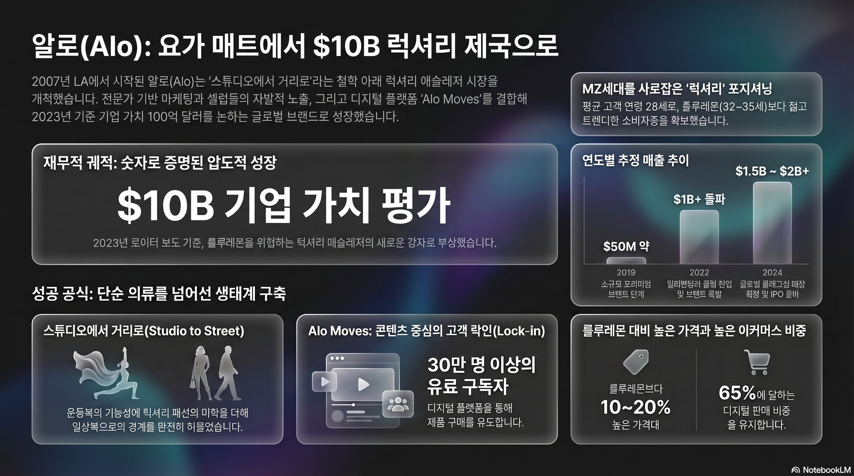 IPO 가능성: 2024년 말 기준 알로는 IPO를 준비 중인 것으로 알려졌습니다. $10B 밸류에이션으로 상장할 경우 룰루레몬(시가총액 $30~40B)의 1/3 수준이지만, 성장률은 훨씬 높습니다.