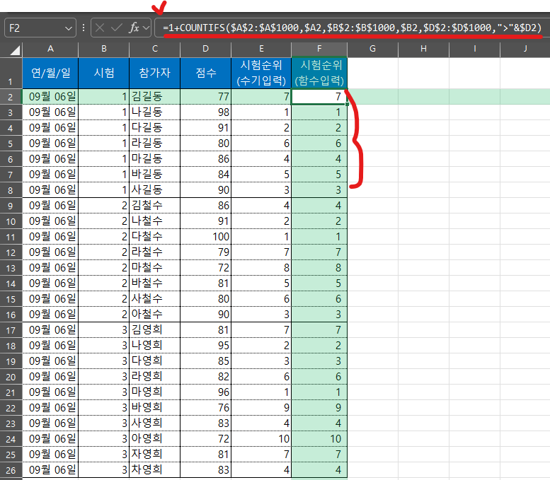 원하는 열 이름은 자유롭게 바꾸셔도 됩니다. 핵심은 같은 날짜·같은 시험 그룹 안에서 순위를 매긴다는 점!
