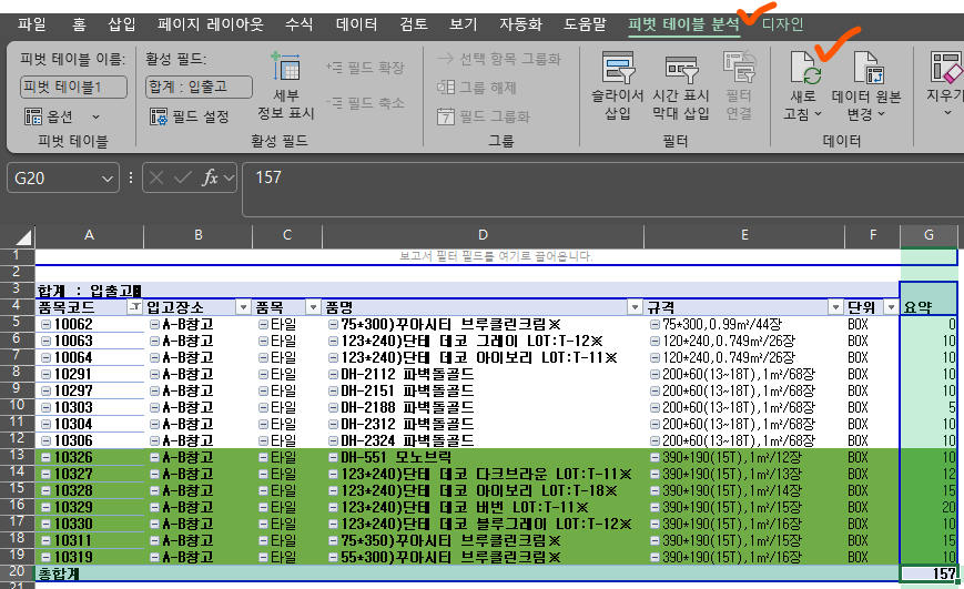 - 행(ROWS): 품목코드 → 입고장소(또는 보관창고) → 품목 → 품명 → 규격 → 단위