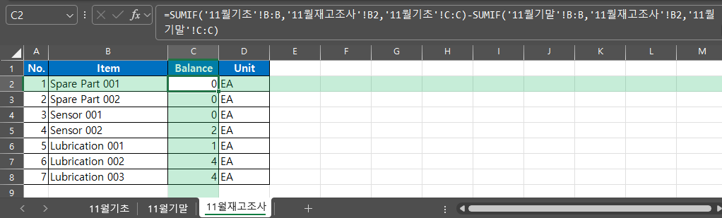 - 동일한 품목 목록을 가진 두 시트(예: “재고_전”, “재고_후”)를 비교할 때는 VLOOKUP보다 SUMIF로 시트별 수량 합계를 구한 뒤 차이를 빼는 방식이 훨씬 안정적입니다.