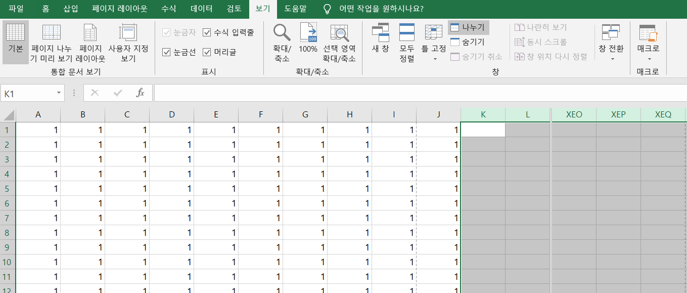 - 엑셀 오른쪽 회색 영역은 대부분 ① 페이지 나누기 미리보기(보기 모드) ② 창 나누기 ③ 틀 고정 ④ 숨김/스크롤 영역 문제 중 하나로 발생합니다.