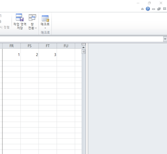 - 즉, 오른쪽 회색은 **워크시트 영역이 아니라 ‘엑셀 프로그램 배경’**이라서 FV/FW 같은 헤더가 존재할 수 없고, 스크롤바는 “현재 워크북 창의 끝”에 붙어 중간에 보입니다.