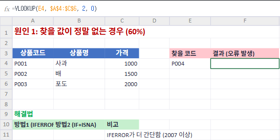 =IF(ISNA(VLOOKUP("P004", A:B, 2, 0)), "미등록", VLOOKUP("P004", A:B, 2, 0))