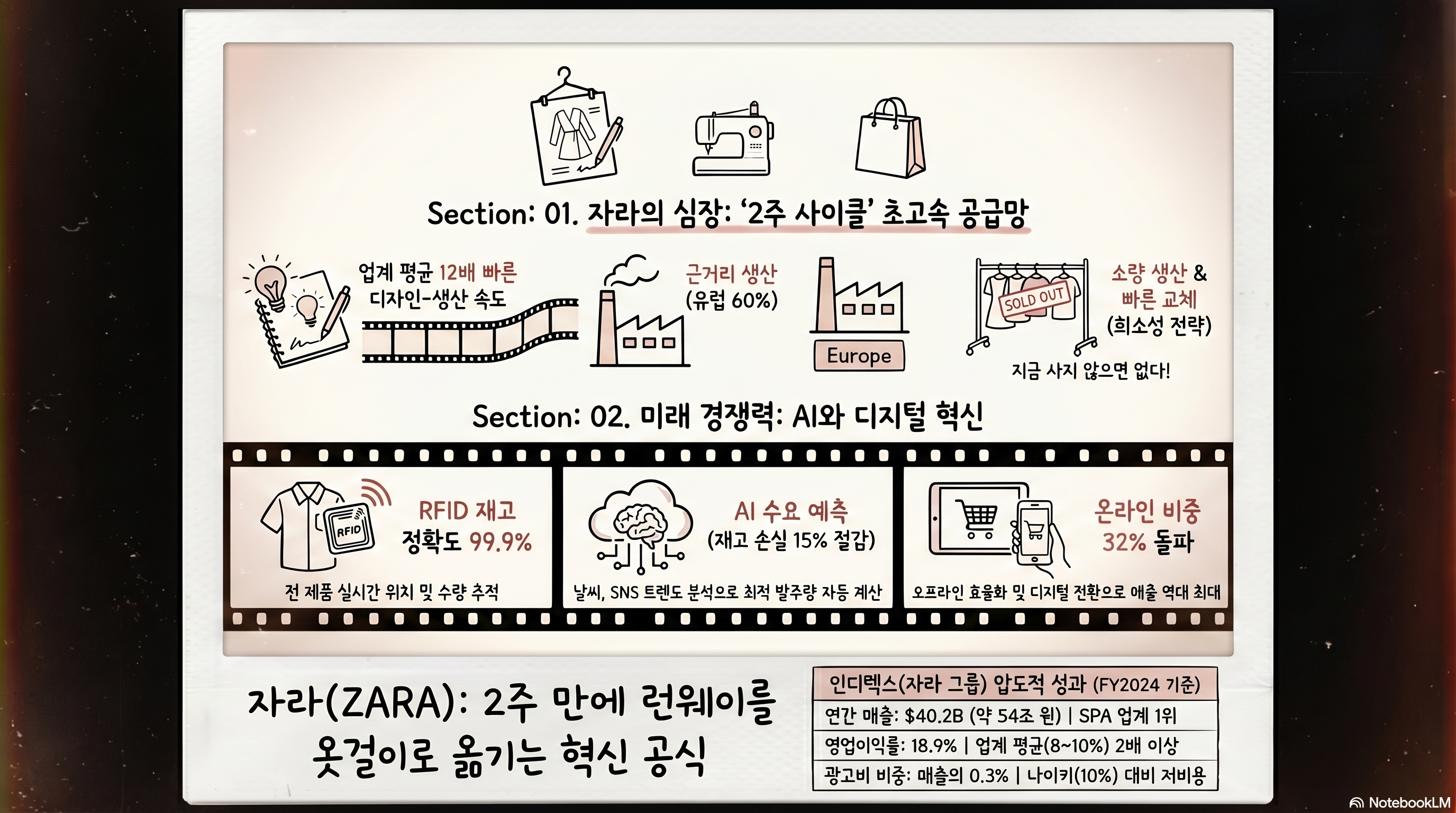 패션 업계 평균 영업이익률이 8~10% 수준임을 고려하면, 자라의 18.9%는 경이적입니다. 비결은 세 가지입니다.