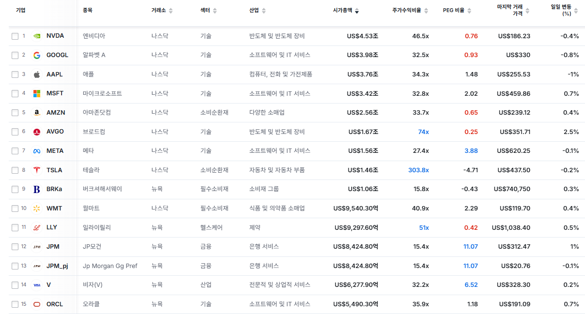 | 9 | BRK.B | 버크셔 해서웨이 B | 493.29 | ≈ 453.31 | +8.8% |