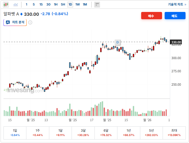 - 알파벳 시총: 약 3.98조 달러, 1년간 +69~72% 상승(보통주/우선주 각각).