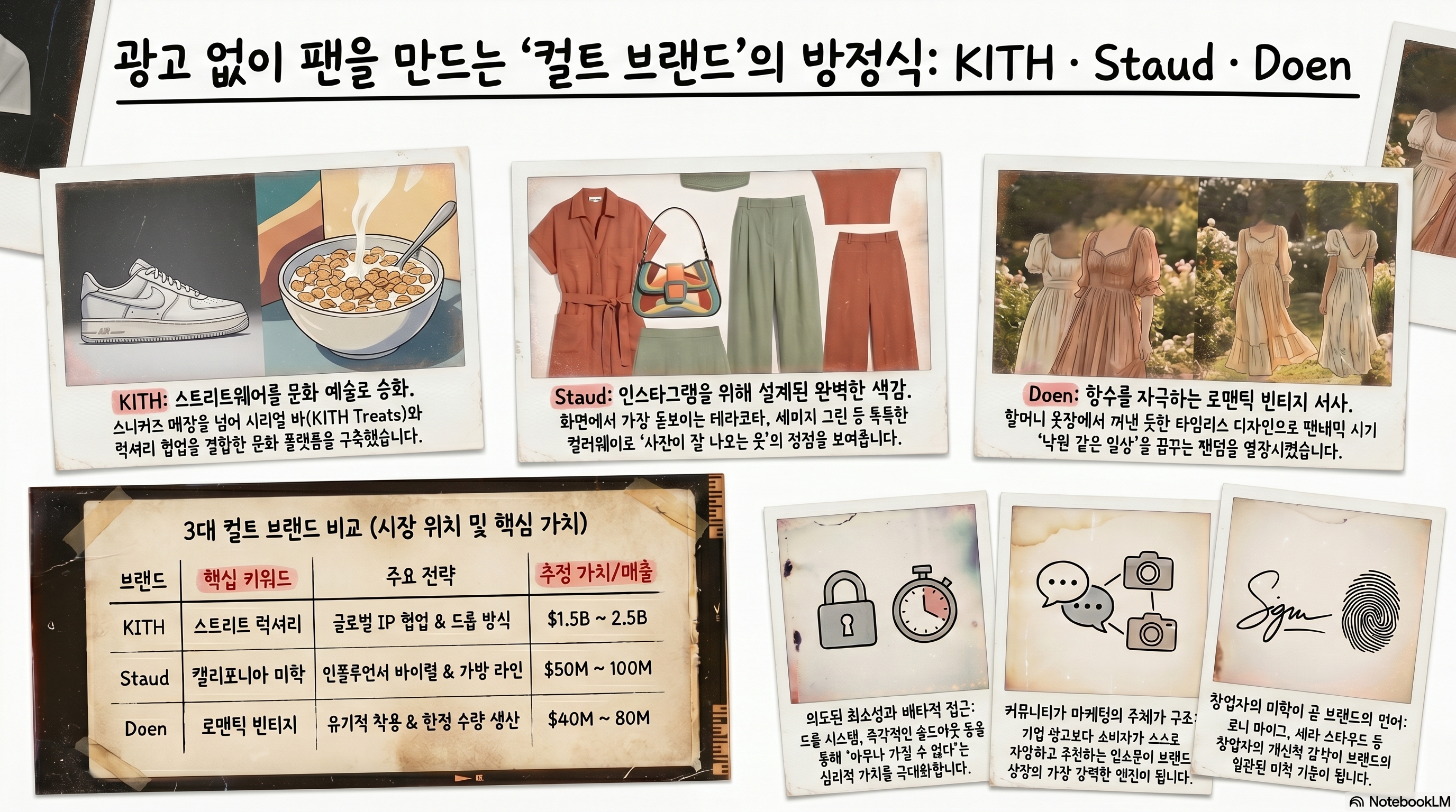 마케팅 예산이 전부가 아닙니다. KITH, Staud, Doen 모두 나이키·H&M 같은 마케팅 파워 없이 열렬한 팬덤을 만들었습니다. 그 비결은 단 하나입니다. "이 브랜드가 아니면 안 된다"는 느낌을 만드는 것. 희소성, 미적 일관성, 커뮤니티, 그리고 창업자의 진정성이 그 느낌을 만듭니다.