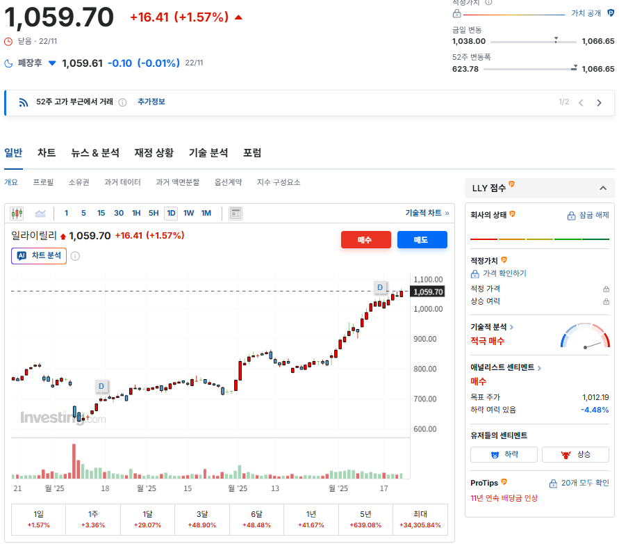 바로 **일라이릴리(LLY)**가 시가총액 1조 달러(T)가 넘었습니다.