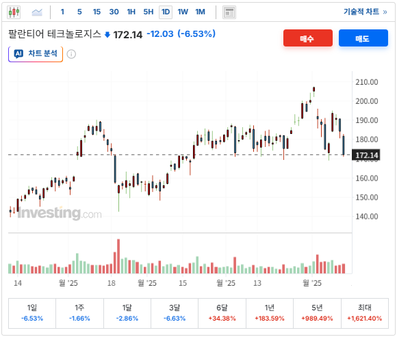 팔란티어(PLTR)도 예외는 아니었습니다. 최근 몇 주간 밸류에이션 논란의 중심에 섰던 팔란티어는 11월 13일에도 조정 흐름을 이어갔습니다.
