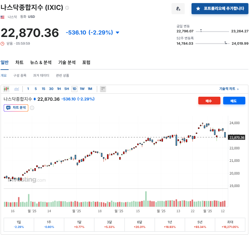 - 나스닥: 22,870.36 (-2.29%)