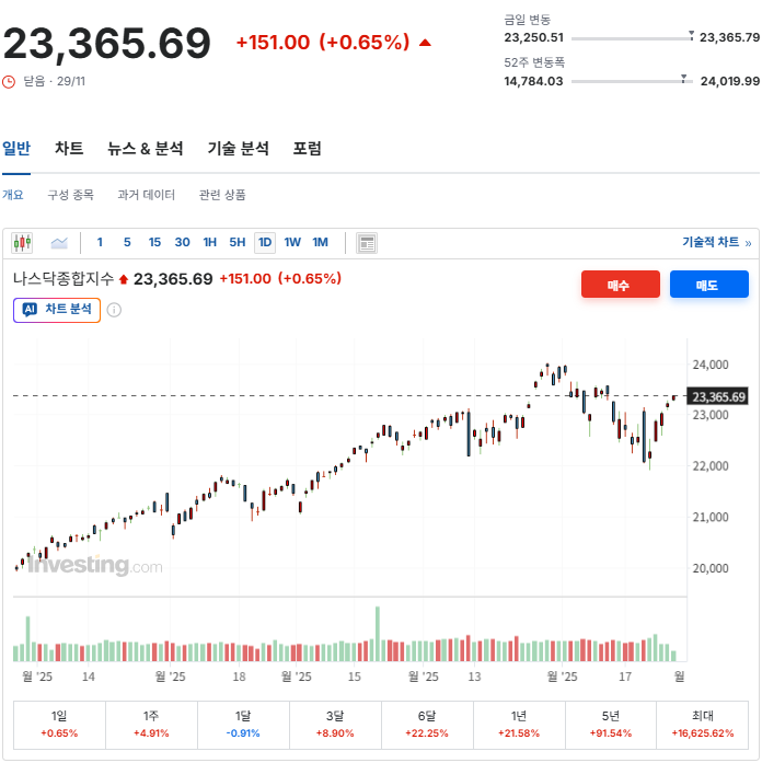 이번 추수감사절 주간 강세, 연말 계절성(12월은 통계상 S&P에 세 손가락 안에 드는 ‘좋은 달’), 여기에 **12월 금리 인하 기대 80%**까지 감안하면, 지수가 하루아침에 -2~-3%씩 무너질 환경은 아니다 쪽이 합리적인 판단입니다. 다만 중국 둔화, AI 버블 논쟁, 미국 지표 공백 같은 리스크가 남아 있어 “대세 상승”이라기보다는 위아래로 흔들리는 우상향 정도를 염두에 두는 편이 좋겠습니다.