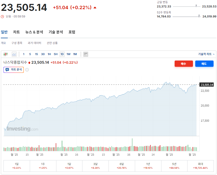 - 나스닥: +0.22% 상승한 23,505.14로, 지난 9거래일 중 8일 상승을 기록하며 역대 고점에서 2% 남짓한 수준.