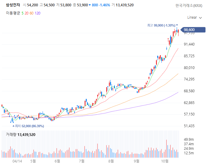 - 10/21일 최고 99,900원까지 도달, 10만원도 조만간 뚫을 수 있으리라 보입니다.