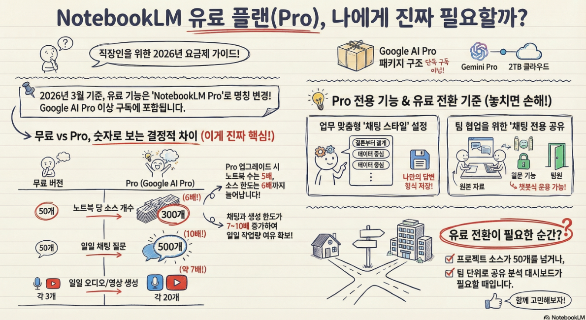 NotebookLM 하나만 놓고 보면 무료로도 충분한 경우가 많습니다. 하지만 구글 AI 전체 생태계를 같이 쓸 계획이라면 AI Pro는 가성비가 나쁘지 않습니다.