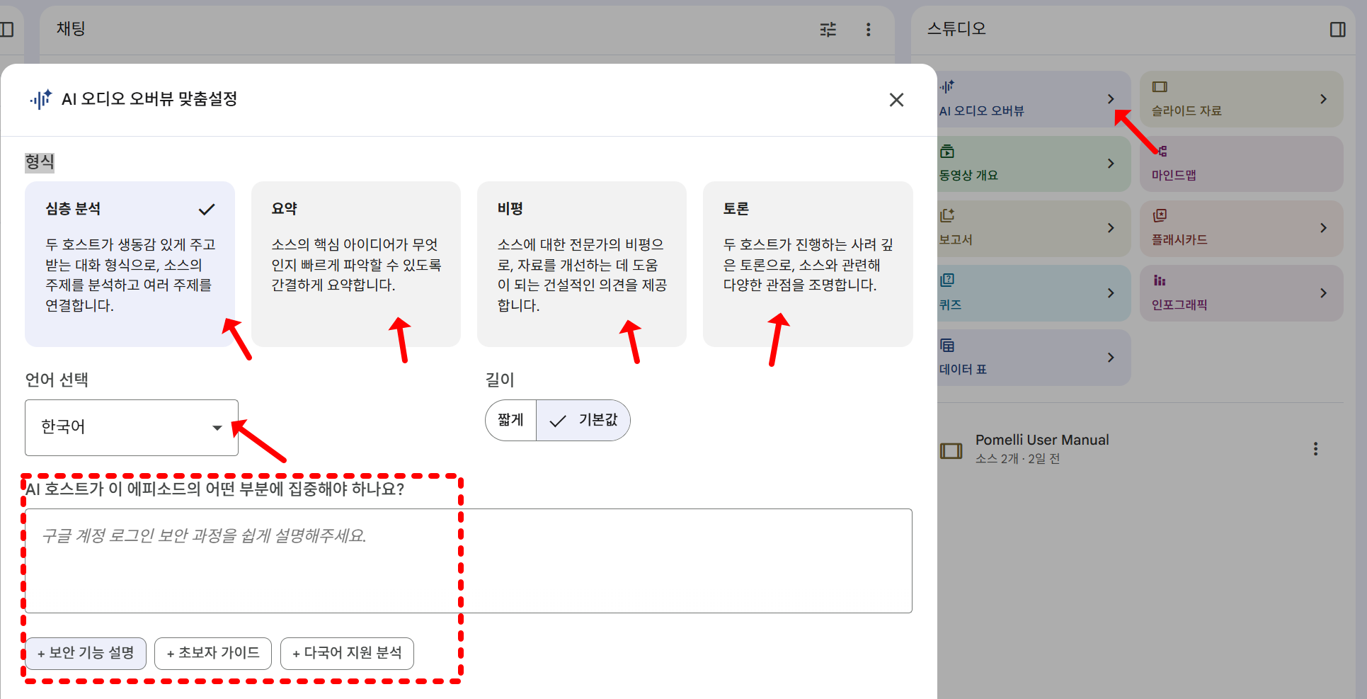 또한, 소스 내용을 파악하고 AI 호스트가 어떤 목적이나 방향성으로 오디오를 만들어 줄지 선택하거나, 직접 프롬프트를 입력해 본인만의 원하는 오디오를 만들 수 있습니다.