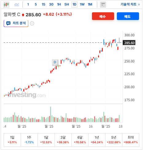최근 Gemini + 인프라 CapEx 확장이 시장에서 긍정적 평가를 받는 중.