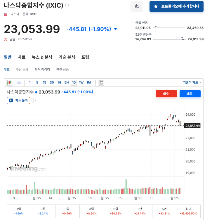 대형 기술주 중심의 매도세가 재개되며 **나스닥 -1.9%, S&P500 -1.1%, 다우 -0.8%**로 마감했습니다.