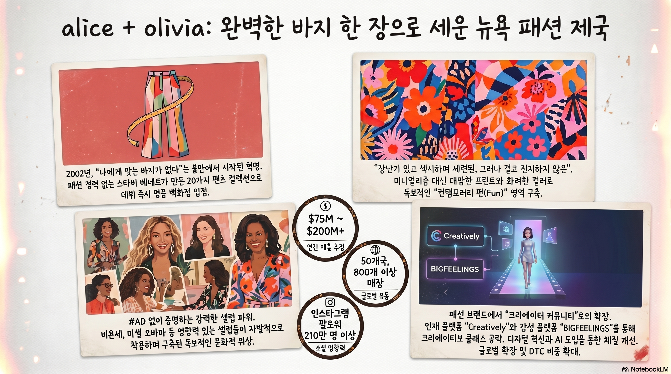 alice + olivia는 완벽한 바지를 만들겠다는 한 여성의 집념에서 시작해 셀럽들의 옷장을 점령하는 뉴욕 컨템포러리 패션 브랜드가 됐습니다. "진지하지 않은 패션"이라는 포지셔닝은 쉬워 보이지만, 20년간 일관되게 유지하는 것은 결코 쉽지 않은 일입니다. 컨템포러리 패션 시장의 구조적 도전을 AI와 디지털 채널 확장으로 어떻게 극복하느냐가 향후 alice + olivia의 핵심 과제입니다.