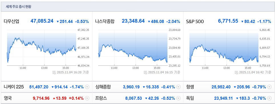 빅테크 약세로 나스닥 -2%, S&P500 -1.2%, 다우 -0.5% 하락 마감. 팔런티어(PLTR) 실적 선방에도 급락, 엔비디아(NVDA) 도 동반 약세. 은행 CEO들의 “10~15% 조정” 경고가 심리를 눌렀고 변동성 지표(VIX)는 2주 만의 고점 근처로 상승했습니다.