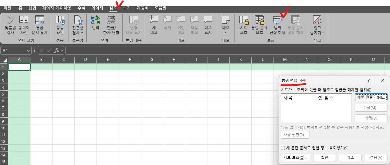 - [검토] 탭 → [범위 편집 허용] 열기.